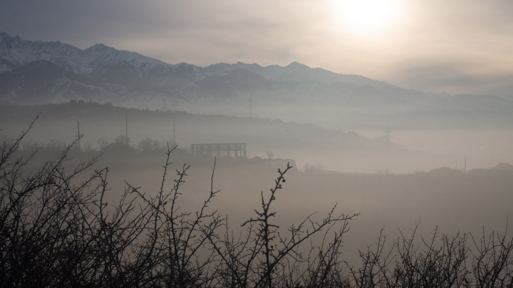 Tammikuun kuudes: näkymä Almatyn yltä. “Synkkä sumu on jäljellä tulipaloista, kaikki näyttää ydintalvelta.”